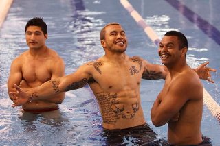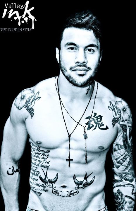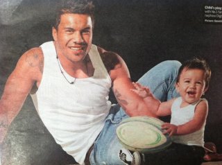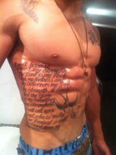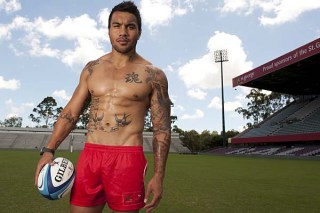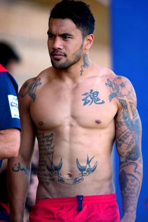 He’s got sleeve patterning tattoos on his left arm. One is of the “woman who means everything to me – my Mum. I’m a mummys boy and always have been so what better way to show that then to get a tatt of mum.” I like that. Too often rugby stars are in the news for beating up their wives, getting wasted and trashing bars, which is why its very refreshing to have those who are firmly grounded with a strong committment to their family and culture.