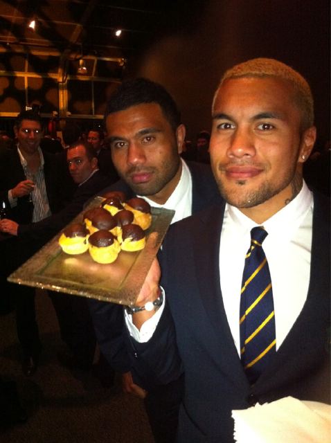 Twenty-six year old Digby was born in Wellington and moved to Australia when he was five. His gift for sports manifested early and he’s been making a powerful reputation for himself on the rugby field since he first represented Victoria in both rugby union and rugby league.He plays for the Queensland Reds and has been capped 11 times for the Wallabies. ( Australia’s National Rugby team – for those Americans who have no clue what “Wallabies” are. The animal or the rugby team.) Digby plays Wing/Outside Centre – which means absolutely nothing to me but that’s okay because this blogpost has nothing to do with rugby whatsoever. According to Wikipedia, Digby is 5ft 10in. According to me, this is very true because I’m 5ft 9 and I towered over Mr Ioane while standing next to him in my super high heeled shoes. (I will not tell you how heavy Digby is according to Wikipedia because then I would have to tell you how heavy I am. How scary that Wikipedia can tell the world your weight, IF you’re famous enough. Cross my heart and hope to die before I ever get unlucky enough to be famous and have a Wikipedia spy satellite invade my house when I’m next jumping on a scale.) Suffice it to say, that after taking one photo with Mr Ioane, I was desperate to get as far away from him as possible because it was making me feel very giantesque. In a Jolly Green Giant kinda way.
