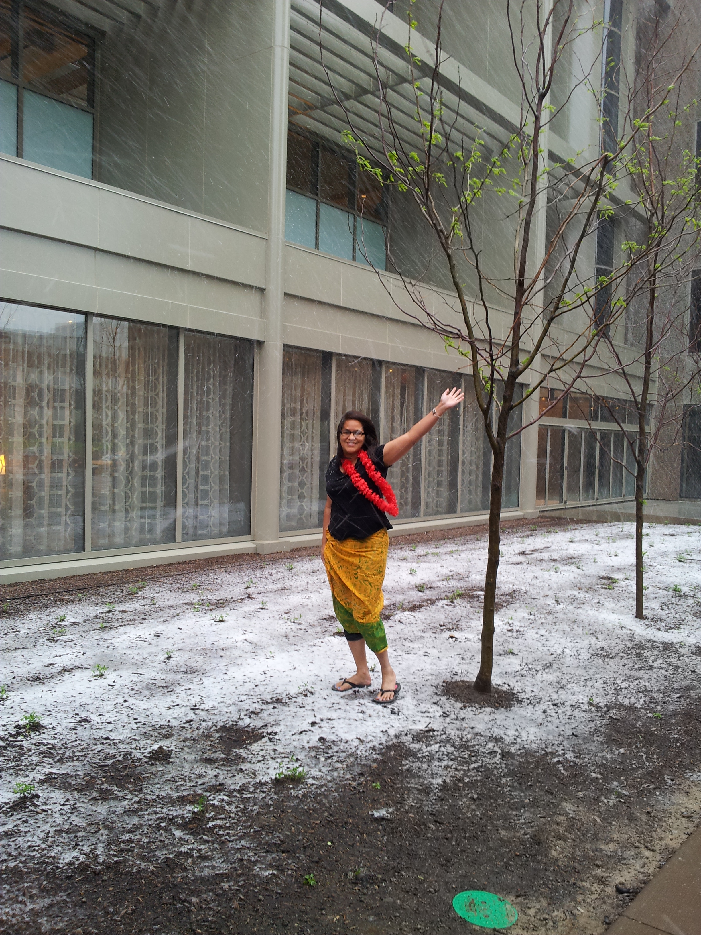 Reporting to you live from Kansas City Missouri… So it snowed for 24 hours. And it was beautiful. I went out in it. I took photos of it. I put photos of it on Facebook. (As you do.) And when a TELESA reader in Sydney, Australia challenged me to wear a lavalava and jandals in it – I did. (Because I’m stupid cool like that.)