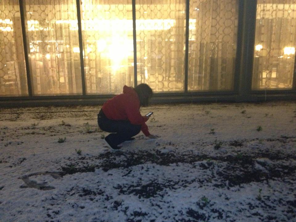 The snow wasn’t sticking and there was only a very light layer on the ground. I wanted to film myself making a snowball to show Bella. (Because that’s what Bad Mothers do when they leave their children to go gallivanting about at book conventions – they find cheap-as creative ways for presents.) The nice doorman told me to check the snow late that night for better snowball consistency, but warned the temperature would be going back up by the next morning. So, I dutifully ran downstairs at about 10pm and out onto the grassy front of the Sheraton Hotel.